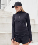 ¼ zip Jersey top with wicking finish. Long sleeves with thumbhole and fold over cuffs. Elasticated binding on cuffs and hem. Raglan shoulder seams with flatlock stitching and reflective dots detail on back of garment. 1/4 length zip with reflective trim and semi-automatic lock zip slider. Stand up self-fabric collar. Side panels. Key pocket on left back panel seam with concealed zip and inner headphone access hole. Tombo tear-out label.